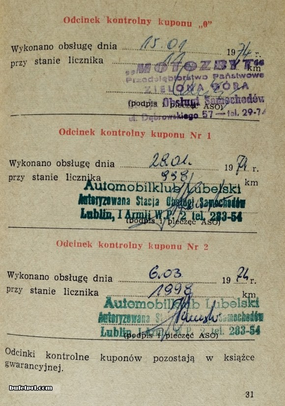 Pan Józef dużo jeździł. Pieczątki z autoryzowanej obsługi pojazdów pokazują, że po dwóch tygodniach miał na liczniku już niemal tysiąc km. Chyba nie był to trwały model, bo już wtedy musiał wymienić włącznik zapłonu, włącznik rozrusznika i inne rzeczy.