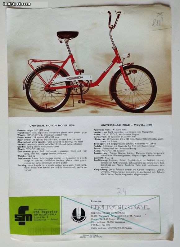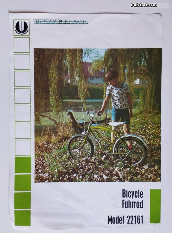 Z tyłu znajduje się opis roweru, w językach angielskim i niemieckim. Tutaj też widać, że Universal jest eksporterem rowerów, a producentem zakłady FSM Bielsko-Biała (te same, które produkowały Syreny i Maluchy). Zakłady miały wiele oddziałów i ten z nr. 8 w Czechowicach produkował rowery właśnie.
