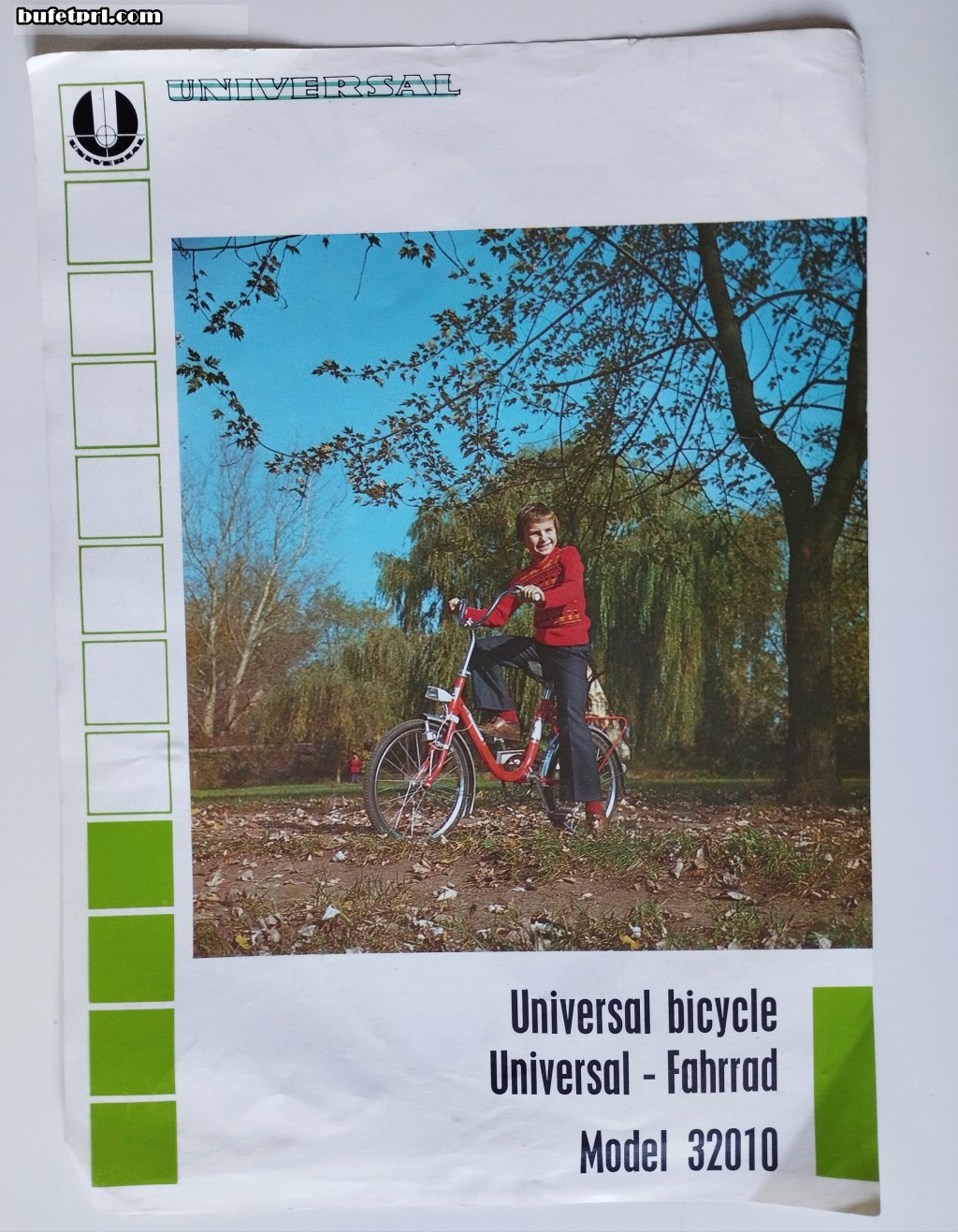 Z tyłu znajduje się opis roweru, w językach angielskim i niemieckim. Tutaj też widać, że Universal jest eksporterem rowerów, a producentem zakłady FSM Bielsko-Biała (te same, które produkowały Syreny i Maluchy). Zakłady miały wiele oddziałów i ten z nr. 8 w Czechowicach produkował rowery właśnie.