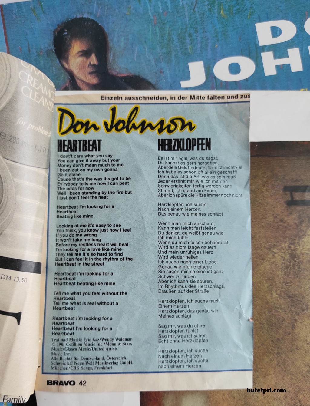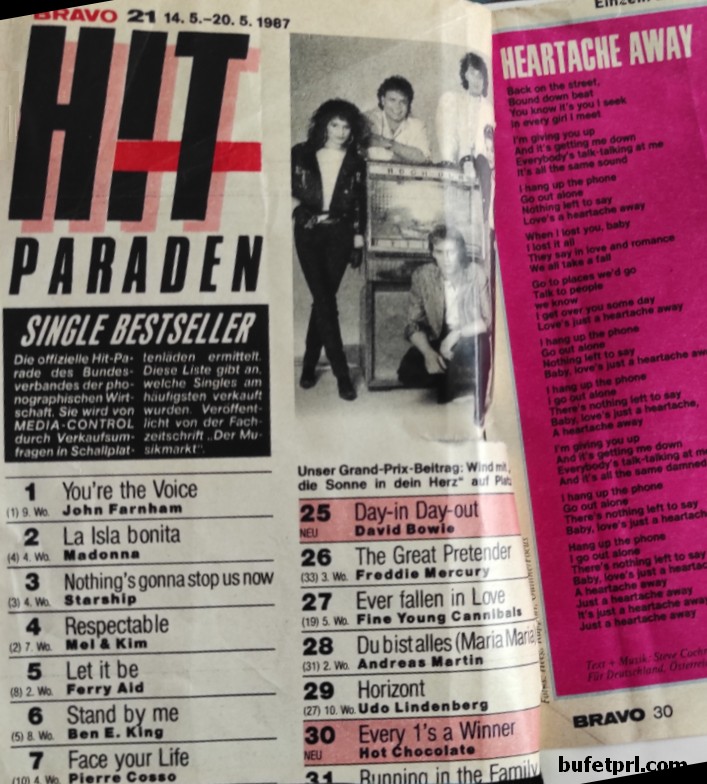 Do wkładki jest przyczepione jeszcze coś. To teksty piosenek z tłumaczeniami z niemieckiego „Bravo”. Ja wycinałem takie z naszej edycji oraz z „Popcornu”. Przy okazji tych tekstów widać singlowe przeboje w Niemczech w maju 1987 r. Są wśród nich m.in. John Farnham i Madonna, ale też artyści u nas wtedy mało znani. No chyba Pierre Cosso nie był u nas wielką gwiazdą co nie?