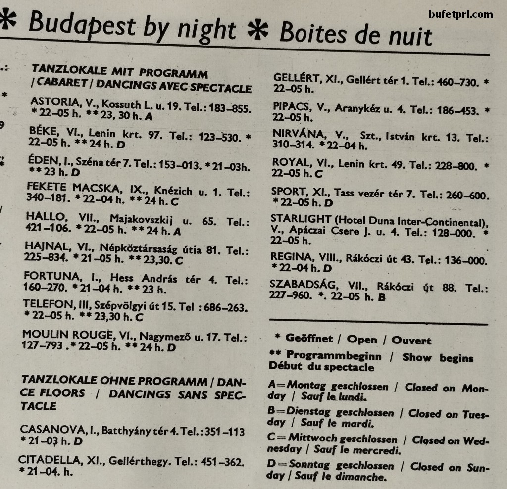 Tutaj mały wykaz nocnych lokali z tańcami. Wśród nic piękne nazwy Astoria, Hallo, Telefon, Casanova, no i Nirvana.