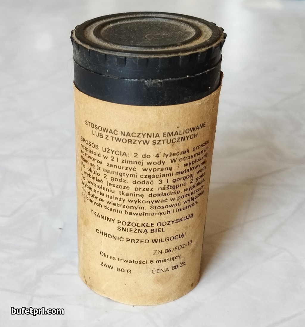 W przypadku kolejnego produktu producent jest mniej zaskakujący. To Spółdzielnia Rzemieślnicza „Zjednoczenie” Zduńska Wola. Cudo nazywa się farbka do płukania z wybielaczem optycznym. Mnie najbardziej zaciekawiła ładna grafika na opakowaniu z praniem wiszącym na sznurku i przypiętym klamerkami.