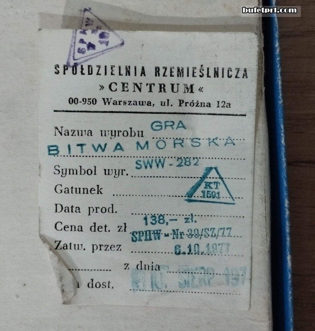 Całość wyprodukowała Spółdzielnia Rzemieślnicza Centrum z Warszawy. Mam już od nich kilka zabawek. Ta Bitwa Morska pochodzi z 1977 roku i kosztowała 138 zł.