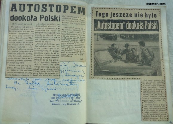W ich dzienniku, obok spisu marek samochodów, które ich zabierały, naklejek hoteli, w których spali, i opakowań słodyczy, które zjedli (na przykład toruńskie „Serca w czekoladzie” marki Kopernik i wafle nadziewane „Teatralne”), znalazły się teksty piosenek i wpisy napotkanych obywateli. Zbierali je od członków radzieckiego cyrku, pracowników barów mlecznych, w których jedli, w zakładach pracy oraz komendach MO, które odwiedzili. Czasami były to zwyczajne pozdrowienia i życzenia udanej podróży, a czasami takie perełki, jak wpis od pracowników Fabryki Pierników i Wyrobów Cukierniczych Kopernik: Krakowska dziewuszka, gdańska wódeczka, warszawski trzewiczek, toruński pierniczek i co krok litościwe auto-stop. To najlepsze rzeczy w świecie, również dla włóczykijów.