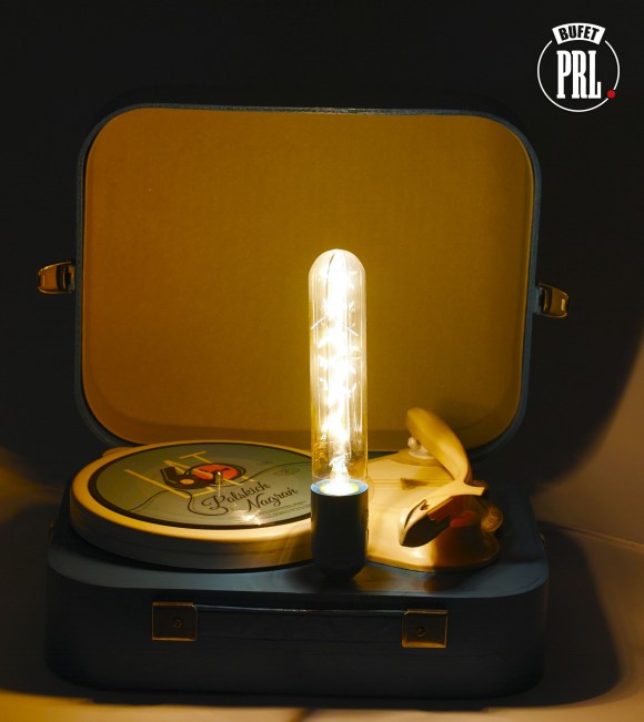 Lampka może pełnić funkcję stolika, na talerzu i płycie można postawić winko, kawę, książkę. Choć uwaga, wszystkiego oryginalnie ruchome części pozostawiłem ruchome 🙂 Ramię, talerz i przełącznik do trzech różnych prędkości się ruszają.