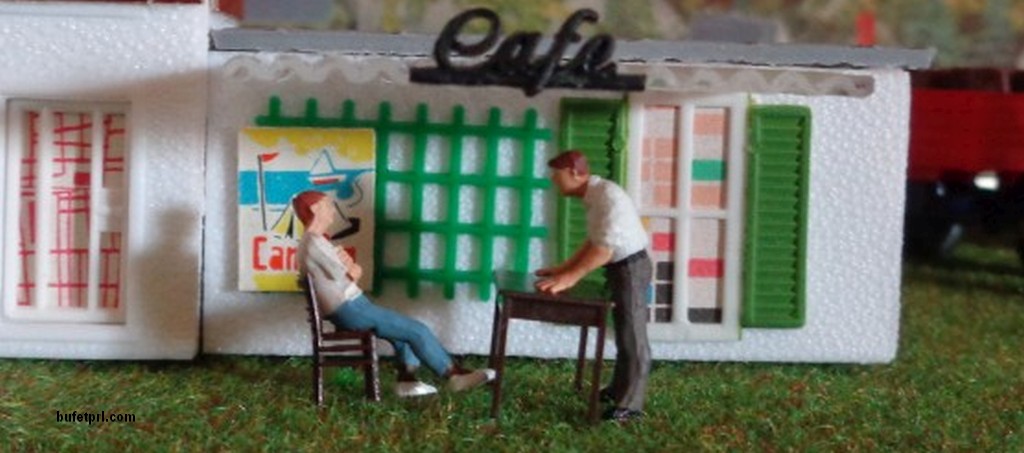 Obsługa, choć wspaniała, zapewne nie dorówna również barmanowi Józiowi (Walenty Kędziorek) ze słynnych, otwartych już w 1945 roku, warszawskich Zakąsek. Był to nowoczesny bar szybkiej obsługi, w którym pan Józio nie mówił do klientów „proszę poczekać”, tylko „już podaję”. A wystrój zapewne nie przebije luksusowej restauracji Paradis na Nowym Świecie (po wojnie mieściła się tu Melodia). Jednak Cafe, które pojawiło się na naszej makiecie H0, o której piszemy w specjalnej zakładce u góry też, mam nadzieję, przyciągnie swoich klientów.