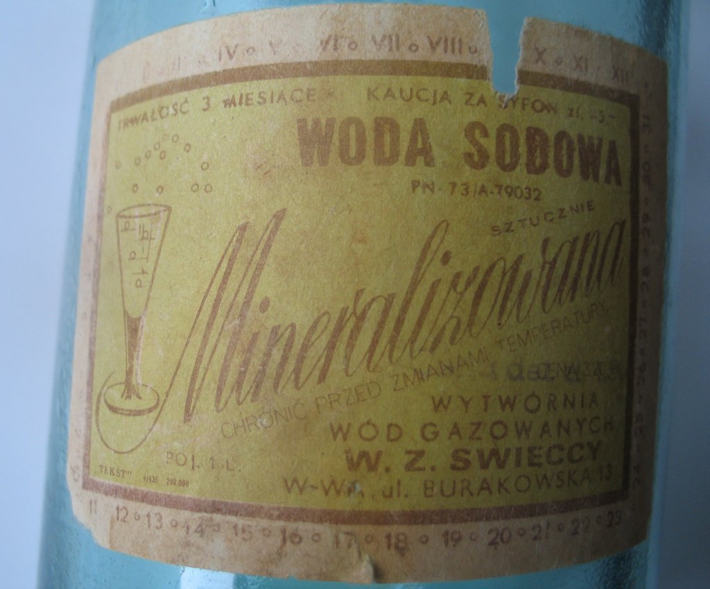 Na etykiecie pierwszego z nich można przeczytać, że wyprodukowano go w Wytwórni Wód Gazowanych W. Z. Świeccy w Warszawie przy ulicy Burakowskiej 13. Woda jest sztucznie mineralizowana, trwałość wynosi 3 miesiąca, a kaucja za sam syfon to koszt 45zł. Na zatyczce ma napis: S.Z.W.G.i z T.Sz. Warszawa. Co to znaczy?