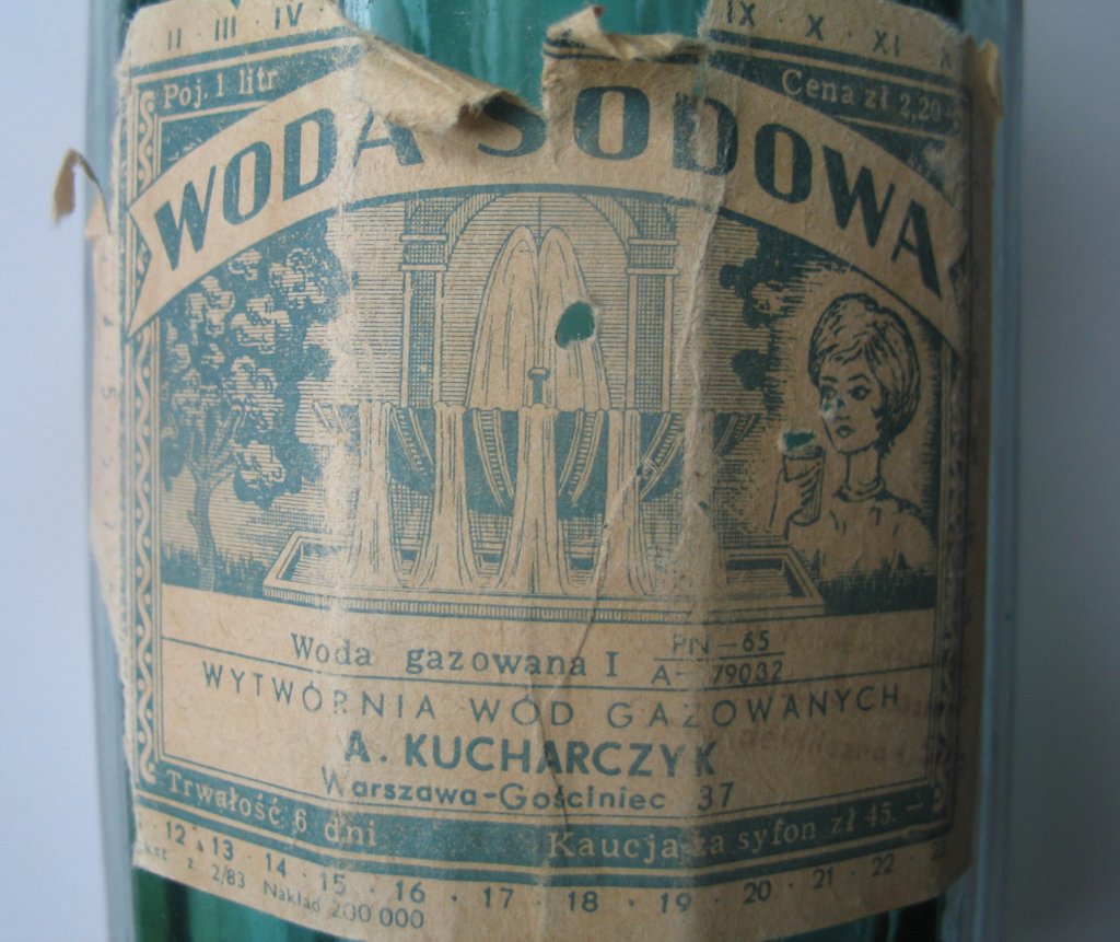 Drugi z nich został wyprodukowany w Wytwórni Wód Gazowanych A. Kucharczyk Warszawa-Gościniec 37. Kaucja też wynosi 45zł, ale trwałość to już tylko 6 dni. Cena napełnienia: 2.20.