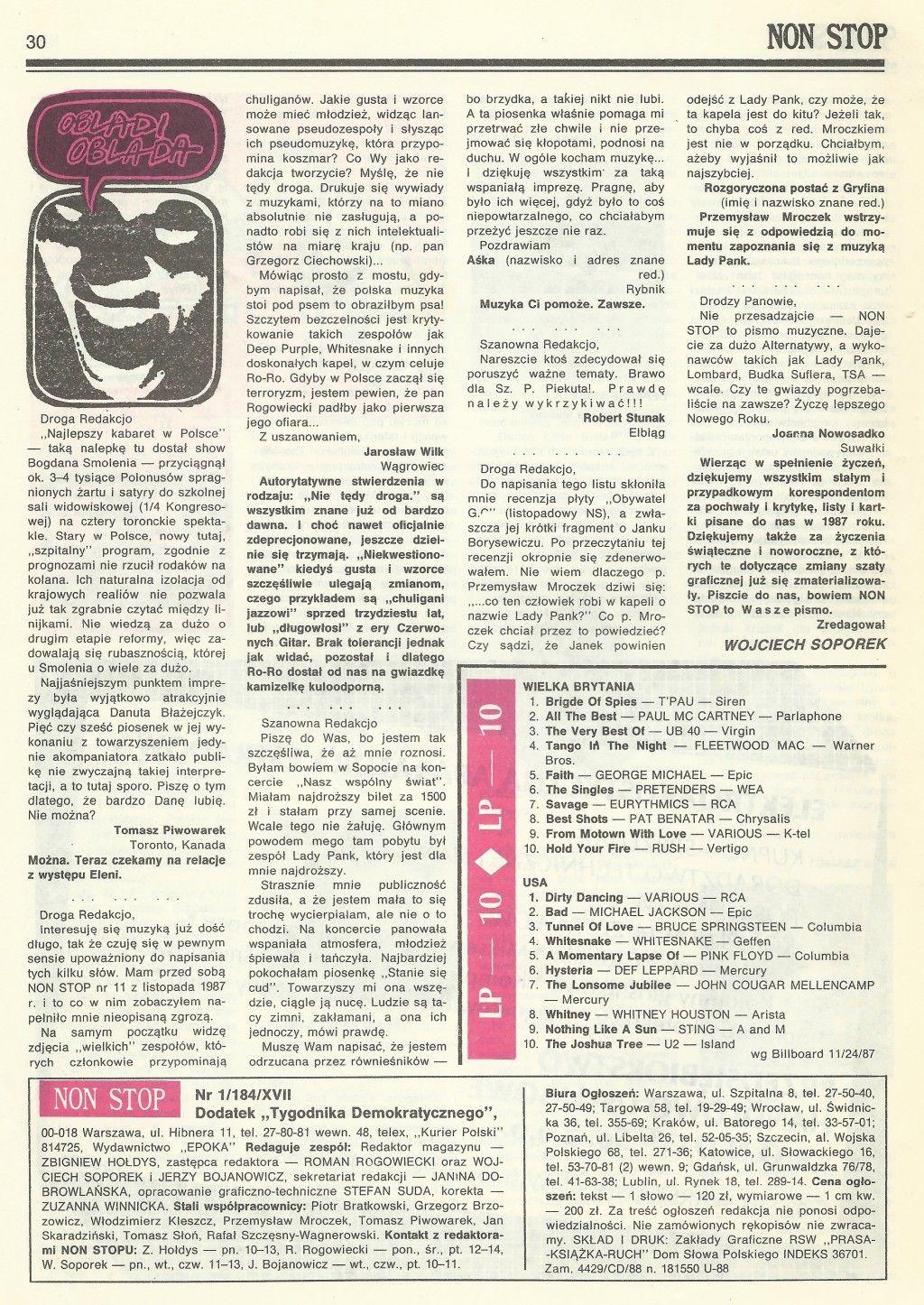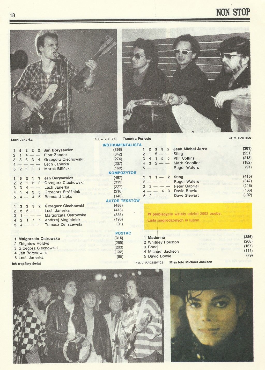 W środku tradycyjnie recenzje płyt, koncertów, reportaże, listy, zestawienia, wywiady itp. W numerze ze stycznia 1988 również podsumowanie roku minionego. W jazzie: narzekanie na młodych artystów, z drugiej strony okopanie się „młodej fali”, ostateczne poddanie się starej gwardii, która obecnie gra na statkach i w hotelach. Rock: komercjalizacja, siła Jarocina, kariery Lecha Janerki, Tiltu, Wojciecha Waglewskiego, zespołów Dezerter i Kult.