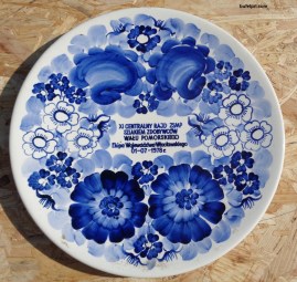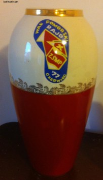No dobrze, przejdźmy dalej. Mamy coś w stylu proporczyków, są jednak zrobione z jakiejś blaszki o miedzianym kolorze. W skrócie firma nazywa się pięknie PRIIBP. Po rozwinięciu nie jest już tak romantycznie. Oto Przedsiębiorstwo Robót Instalacyjno Inżynieryjnych Budownictwa Przemysłowego z Koszalina. Z jednej strony mamy logo firmy, a z drugiej herb Koszalina. Aha, no i u góry piękny kranik.