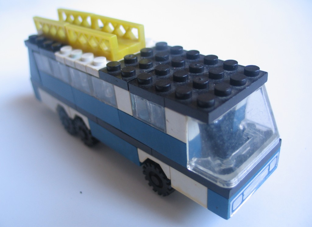 Posiadamy zestaw z oryginalnym kartonem i instrukcją. W środku jest ponad 240 klocków. Wśród nich szokujące wtedy dla nas radiostacje, klocki z nadrukiem przypominającym komputer, niebieskie szyby i lampy zielone oraz czerwone. Są też zawiasy, kierownica i silniki. Oto jak wygląda oryginalny złożony zestaw według instrukcji: