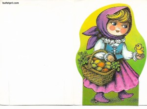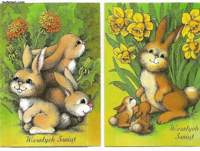 Kolejne dwie to ten sam wydawca, ale już lata 80. No i jest bardziej świątecznie. Rozbita skorupka jajka, do tego bazie. A ta podstawka ceramiczna to może na garnek z białą gotowaną…