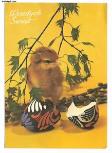 No przyznacie, że to urocza kartka, ale tak hmm, średnio świąteczna. Są pisklaki, ale czy to wystarczająco świąteczny akcent? Wydawca, czyli Krajowa Agencja Wydawnicza twierdziła, że tak. Pocztówka pochodzi z końca lat 70.