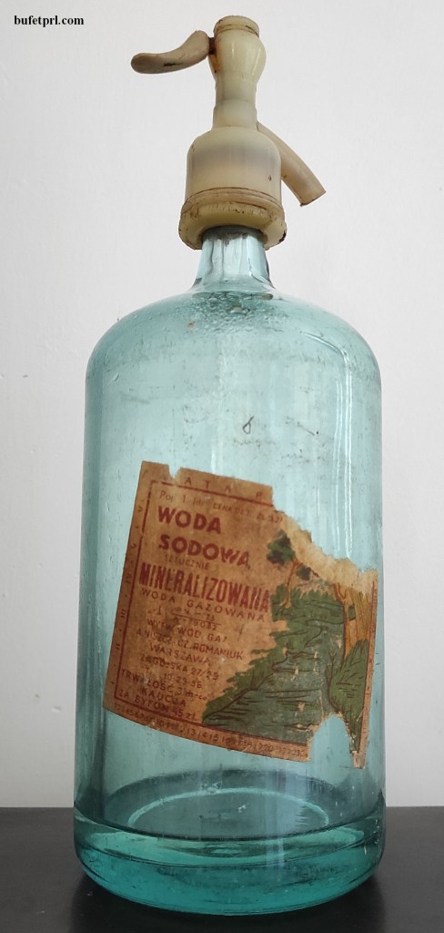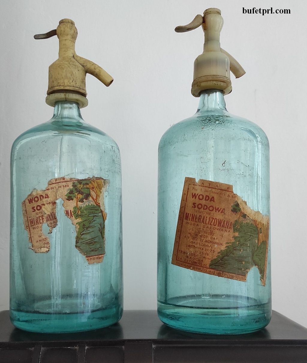 Dwa szklane syfony. Trochę już o nich pisaliśmy, bo mamy kilka, tutaj: https://bufetprl.com/2013/02/12/syfony-z-lokalnych-wytworni-mineralek/